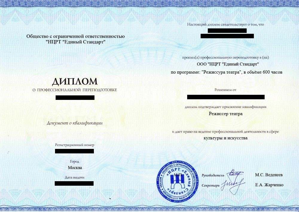 • «Режиссер театра» с правом ведения профессиональной деятельности в сфере культуры и искусства